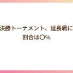 2026.01.13 試合 W杯決勝トーナメント、延長戦に行く割合は〇% mixtrivia_com FIFAワールドカップでは、ノックアウトマッチの 約33.7% が延長戦に突入しています。 1978~2022大会までのデータ。3試合に1回は延長戦まで行っている。 出典はこちら 関連データ: PKは本当に有利?Jリーグの成功率は〇% 0-0と1-1、Jリーグでよく出るのはどっち?割合は〇% 試合開始10分以内にゴールはどれくらい生まれる?確率は〇% アディショナルタイムでゴールはどれくらい生まれる?確率は〇% 先制ゴールが入るまでの時間は平均で何分? 前半を両チーム無得点で終える試合の割合は〇% 先制点を取ったチームが勝つ確率は〇% この手の数字が好きな人向けの本 サッカーデータ革命 ロングボールは時代遅れか/辰巳出版/クリス・アンダーセンposted with カエレバ楽天市場AmazonYahooショッピング サッカーはデータが10割 最強アナリストが明かすプレミアリーグで優勝する方法/飛鳥新社/イアン・グラハムposted with カエレバ楽天市場AmazonYahooショッピング 遠藤保仁がいればチ-ムの勝ち点は117%になる デ-タが見せるサッカ-の新しい魅力/SBクリエイティブ/西内啓posted with カエレバ楽天市場AmazonYahooショッピング